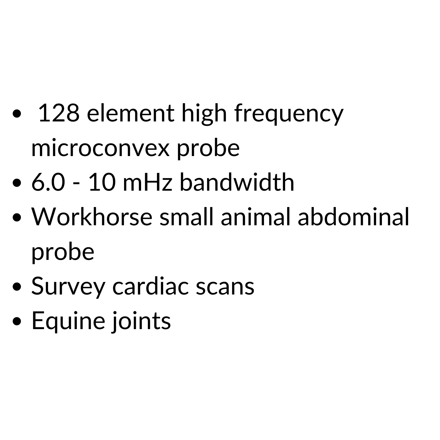 This 128 element high frequency microconvex probe operates between 6 – 10 mHz in combination with the Versana. The small probe face is very useful for navigating intercostally in small animals. This probe is the workhorse for small animal abdominal scans, as well as providing good images for survey cardiac scans. It can also be used to examine the joints of equine patients.